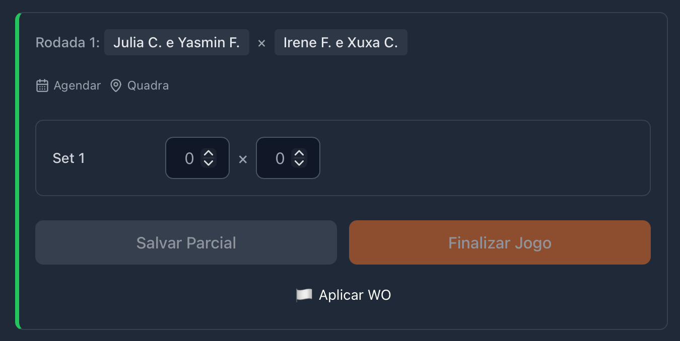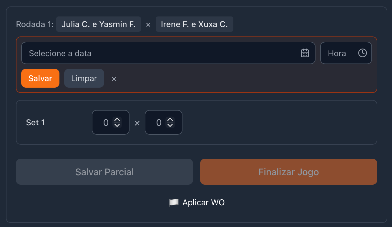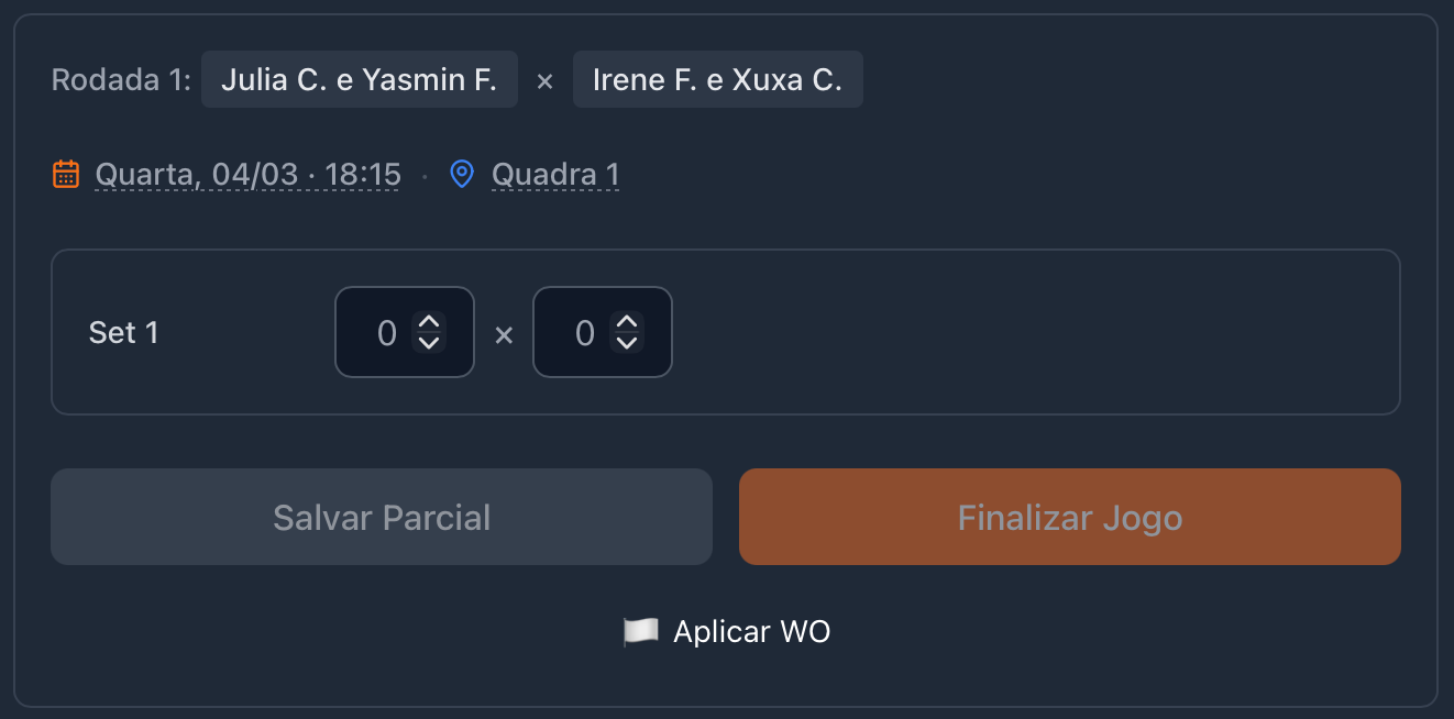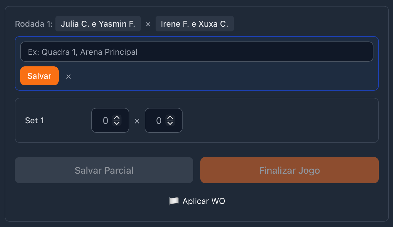 Preencha o placar de cada set e confirme para encerrar a partida