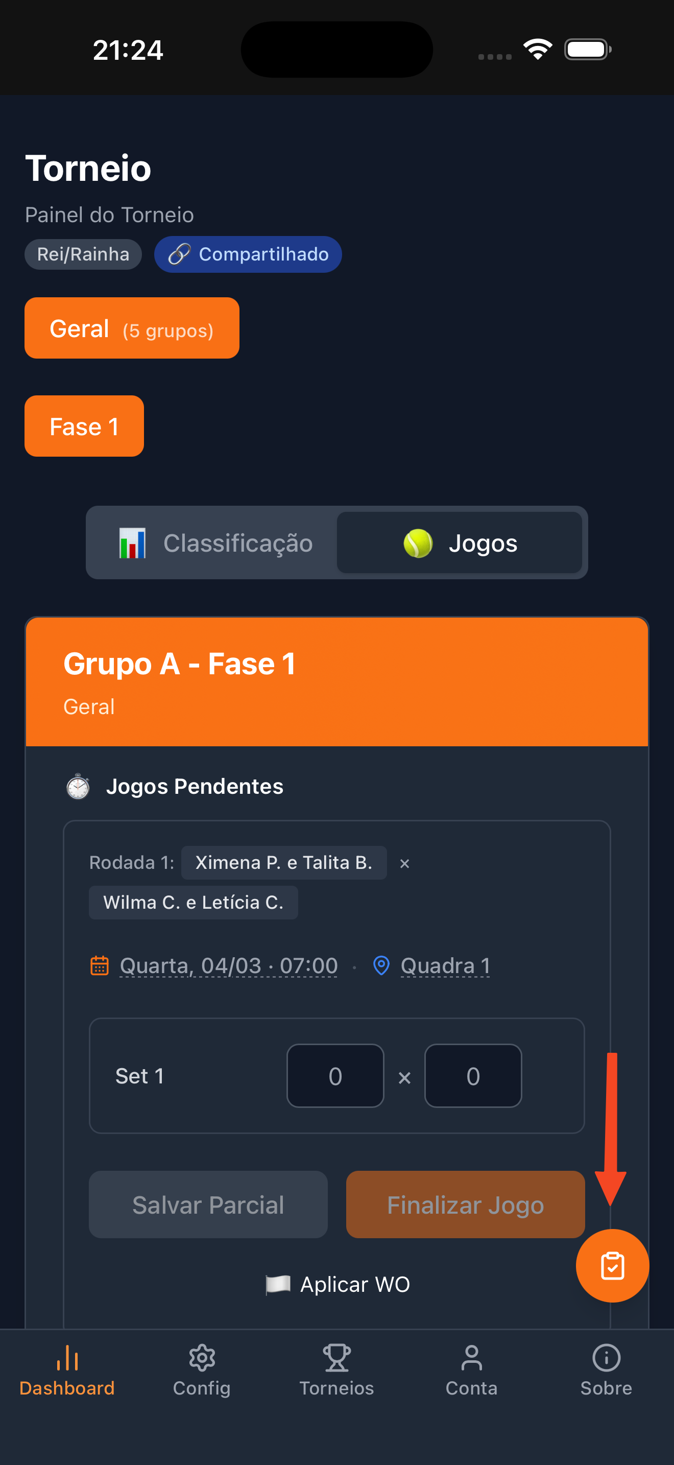 No Dashboard, toque em uma partida para abrir o formulário de placar