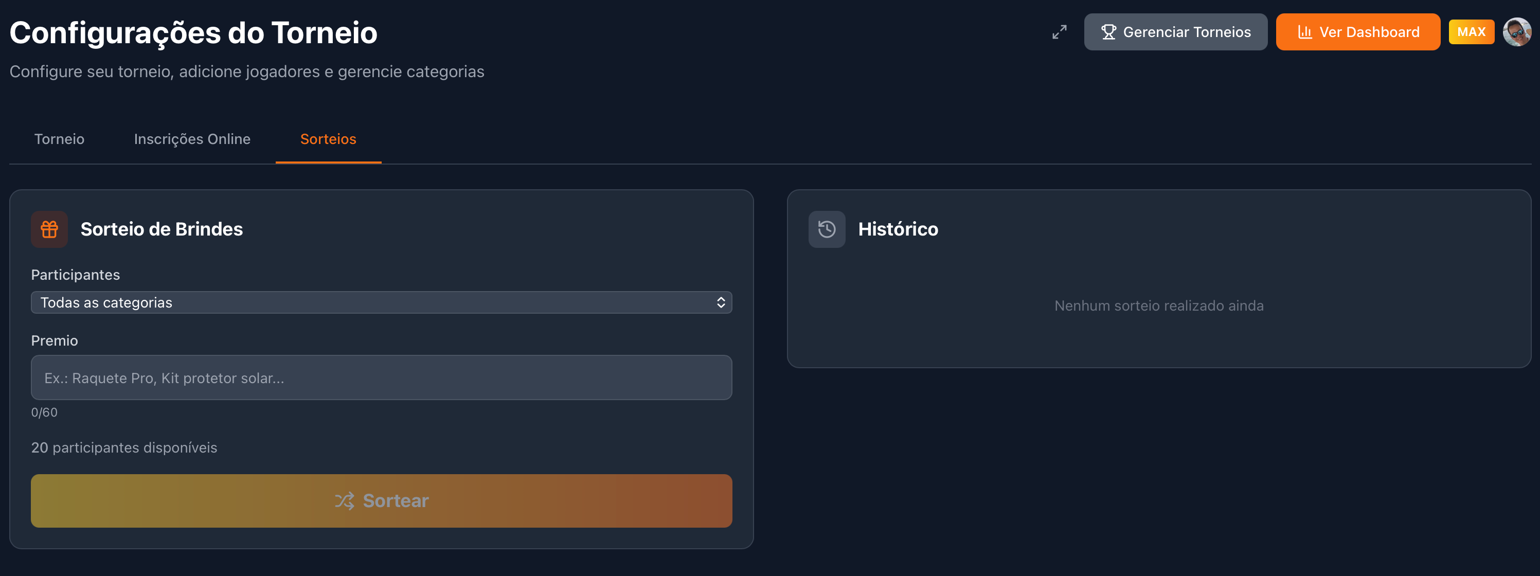 Inscrições onlineMAX: configure vagas, preço e data limite. Em categorias de Duplas, participantes informam o parceiro desejado no formulário. Veja a seção de inscrições online para detalhes.